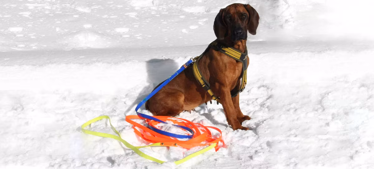 - Främre del (1,5 m): Tillverkad i tjockare blå Gold Opaque Biothane som förhindrar att linan trasslar in sig runt hundens ben.